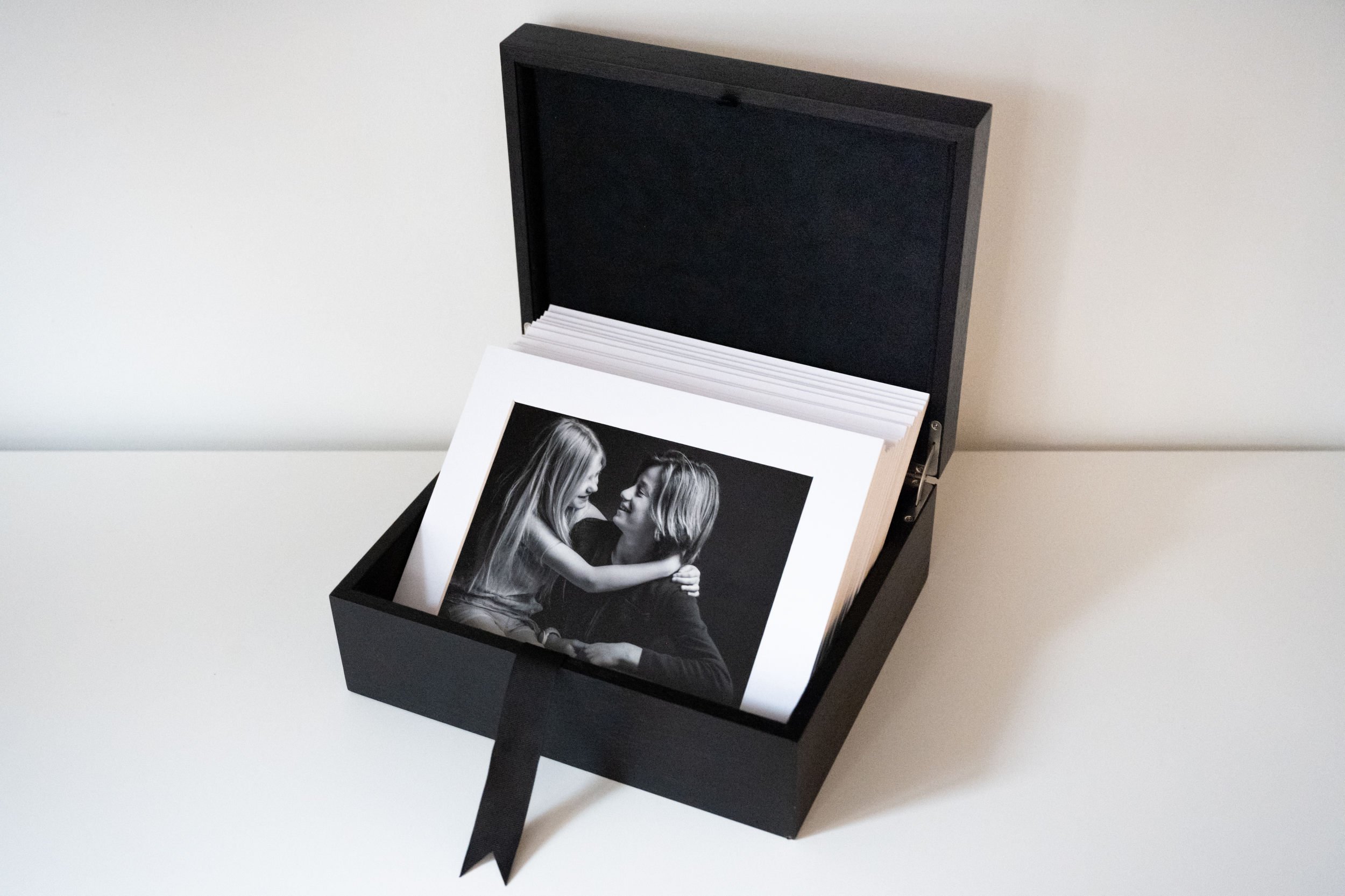 Een stijlvolle aanvulling op jullie kunst aan de muur: de Portretbox pronkt met en bewaart jullie meest dierbare foto’s. Dit product werkt op zichzelf als een tafeldisplay. Een chique bewaarbox met fine art prints in passe partout Het is ons meest veelzijdige product, waarmee je de foto’s afzonderlijk kunt inlijsten en ruimte kunt maken voor jullie volgende portretbelevenis!